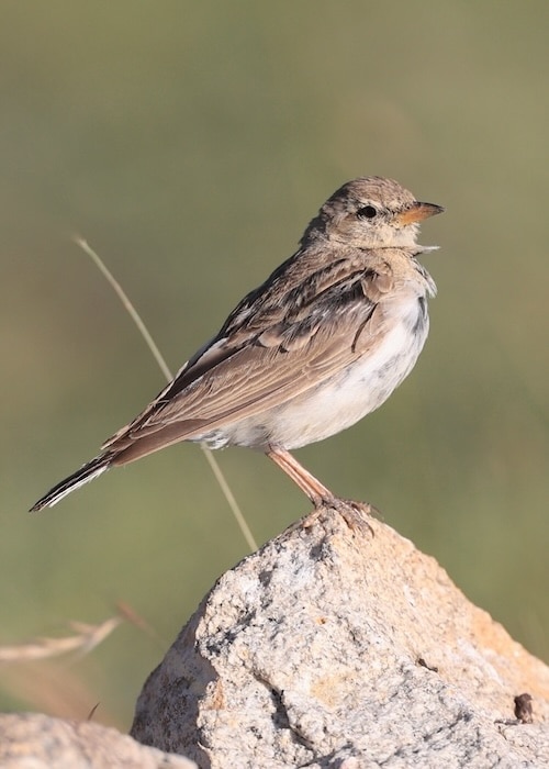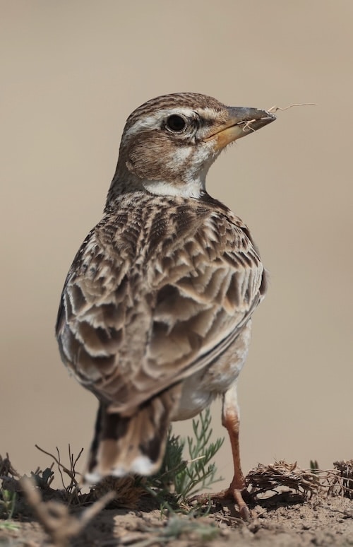 Species AccountSmall, pale brown lark. Sandy-colored above and whitish below, with distinct white eyebrows and a slender bill. -