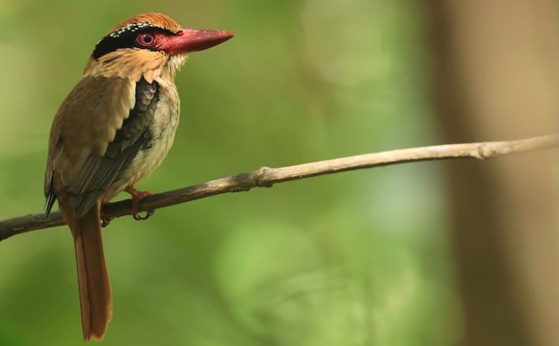 Species AccountA unique forest kingfisher. Largely pale brown with an eye-catching red bill, a prominent dark mask with pale flecks on its upper border, dark wings... -