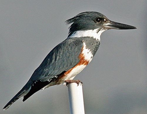 Cornell Species AccountThe Ringed Kingfisher is the largest kingfisher in the Americas. Its heavy, pale-based bill, disheveled crest, blue-gray plumage, white collar, and red belly are visible and recognizable even at a distance. -