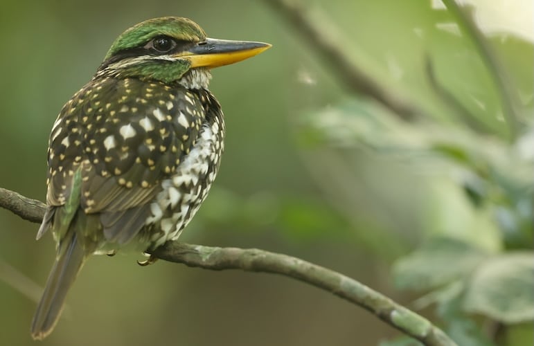 Species AccountA striking medium-sized kingfisher of lowland and foothill forest. Whitish below with dark scaling and dark green above with buff spotting. -