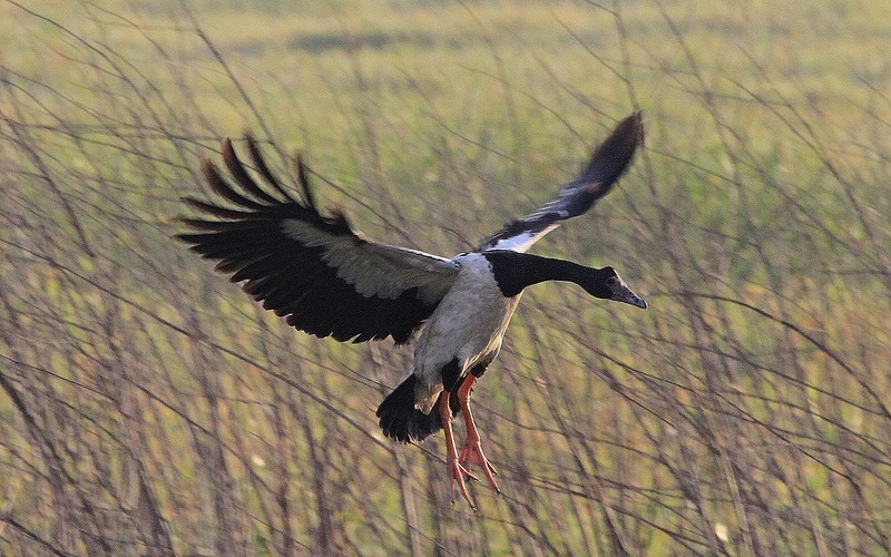 The Magpie Goose has a black neck and head, with a characteristic knob on the crown (larger in males), which increases in size with age. The underparts are white, with contrasting black edges on the underwing. The bill, legs and feet are orange. The Magpie Goose differs from most waterfowl in having strongly clawed toes that are webbed only on their basal halves (i.e. only partly webbed). Females are slightly smaller than males.