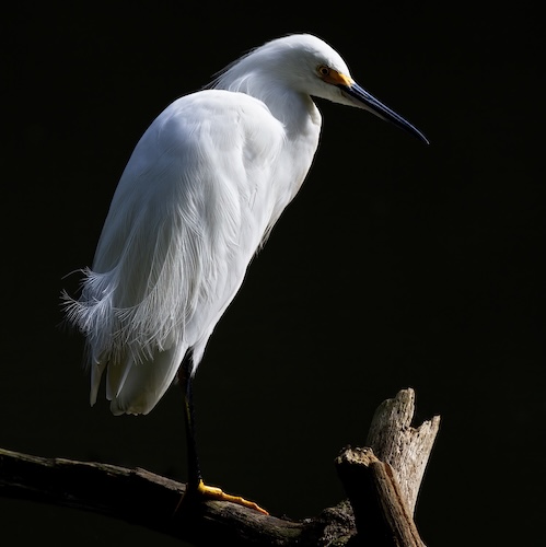 Among the most elegant of the herons, the slender Snowy Egret sets off immaculate white plumage with black legs and brilliant yellow feet.