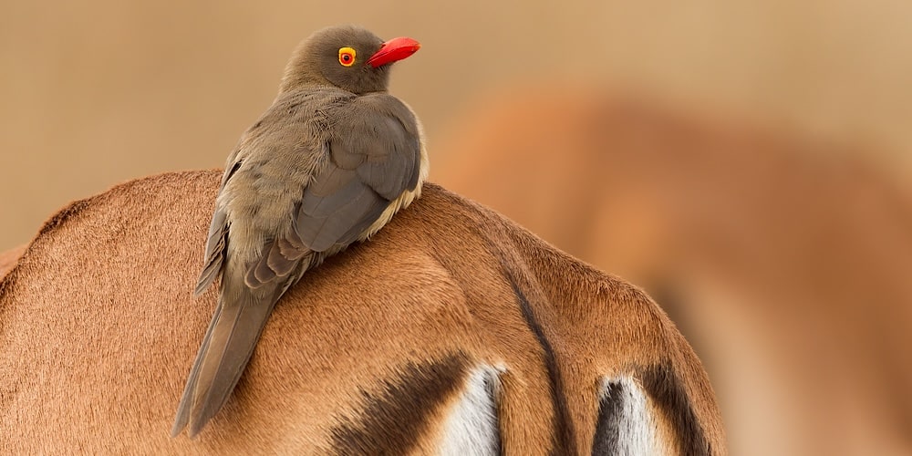 Oxpeckers graze exclusively on the bodies of large mammals. Certain species are seemingly preferred, whereas others, like the Lichtenstein’s hartebeest or Topi are generally avoided. Smaller antelope such as lechwe, duikers and reedbuck are also avoided; the smallest regularly used species is the Impala, probably because of the heavy tick load and social nature of that species. In many parts of their range, they now feed on cattle, but avoid camels. They feed on ectoparasites, particularly ticks, as well as insects infesting wounds and the flesh and blood of some wounds as well. They are sometimes classified as parasites, because they are known to deliberately open wounds on the animals’ backs.
