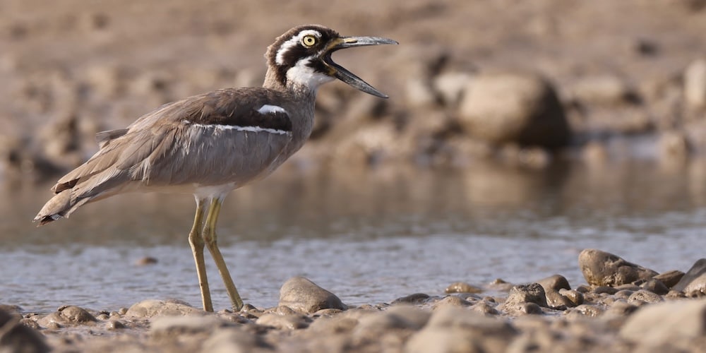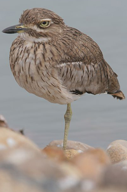 They are medium to large birds with strong black or yellow black bills, large yellow eyes, which can give them a reptilian appearance, and cryptic plumage. The names thick-knee and stone-curlew are both in common use, the preference among authorities for one term or the other varying from year to year. The term stone-curlew owes its origin to the broad similarities with true curlews (which are not closely related). They get their alternative name of thick-knee from the swollen ‘knee’ joint (which, as in all birds, is actually more akin to an ankle joint) on their long yellow or greenish legs. It apparently originated with a name coined in 1776 for Burhinus oedicnemus, the Eurasian stone-curlew. Obviously, the ankle (heel) and the knee were anatomically confused.