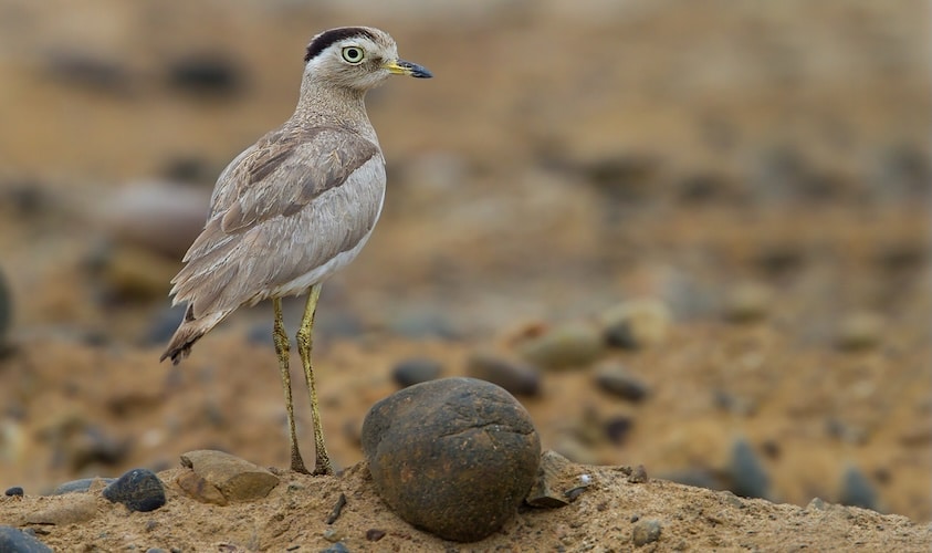 Named for the stony ground on which they live, one of the most striking features of the stone-curlews is their large, piercing yellow eyes, an adaptation to their crepuscular lifestyle – they are most active at dawn, dusk and through the night. Their mottled brown and sandy plumage is ideally suited as camouflage on open, sandy ground, where their nest is often little more than a scrape in the ground.