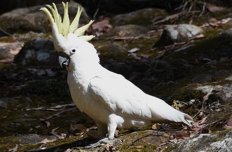 Species AccountThe Sulphur-crested Cockatoo is a large white parrot. It has a dark grey-black bill, a distinctive sulphur-yellow crest and a yellow wash on the underside of the wings. -