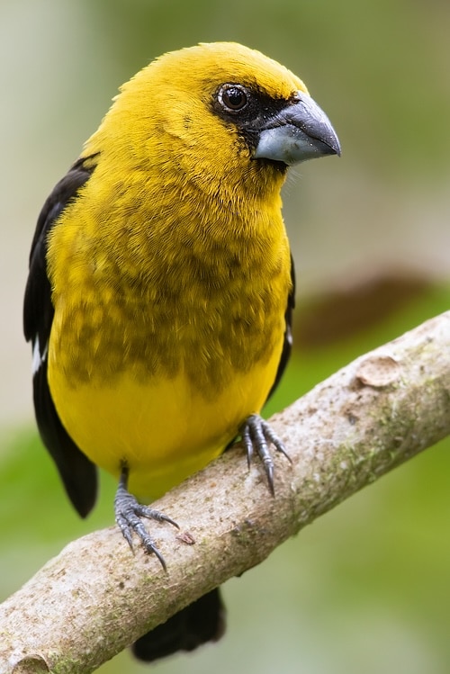 Species AccountLarge-billed bird with yellow head, body, and black back and wings. Look for massive triangular bill and obvious white patch on wing. Sexes similar. -