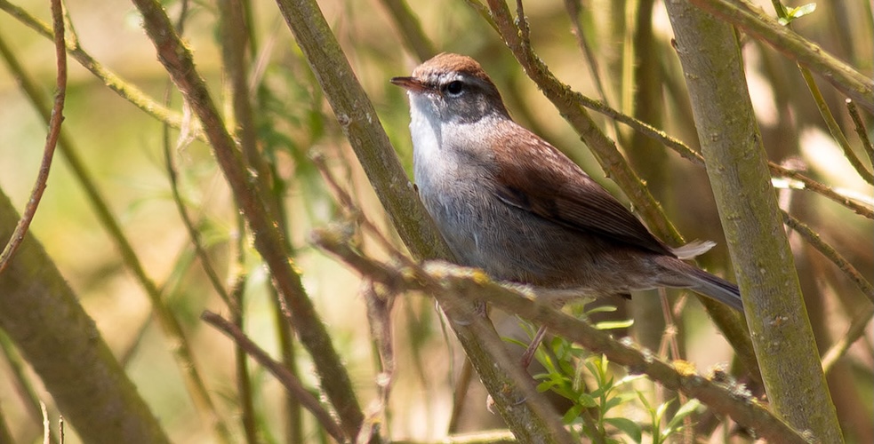 A small, rather nondescript bird, Cetti's warbler (pronounced chetty) is a skulking bird and can prove very difficult to see. It usually makes its presence known with loud bursts of song and the first glimpse will probably be of a dark, rather stocky warbler with short wings and a full, rounded tail, diving for cover. It is one of the UK's most recent colonists, first breeding here in 1973.