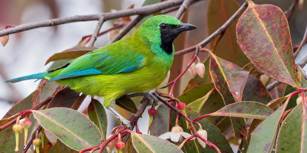 Leafbirds are always found in trees and shrubs. Most are restricted to evergreen forests except the Golden-fronted Leafbird and Jerdon’s Leafbird which live in deciduous monsoon forests, and the Orange-bellied Leafbird, which occurs in deciduous forests. Within this requirement, they occupy all broadleaf forest types in the South and Southeast Asia. The highest altitude they occur at is 2500m. Some species, such as the Blue-masked Leafbird, have montane distributions, rarely descending below 1000m.