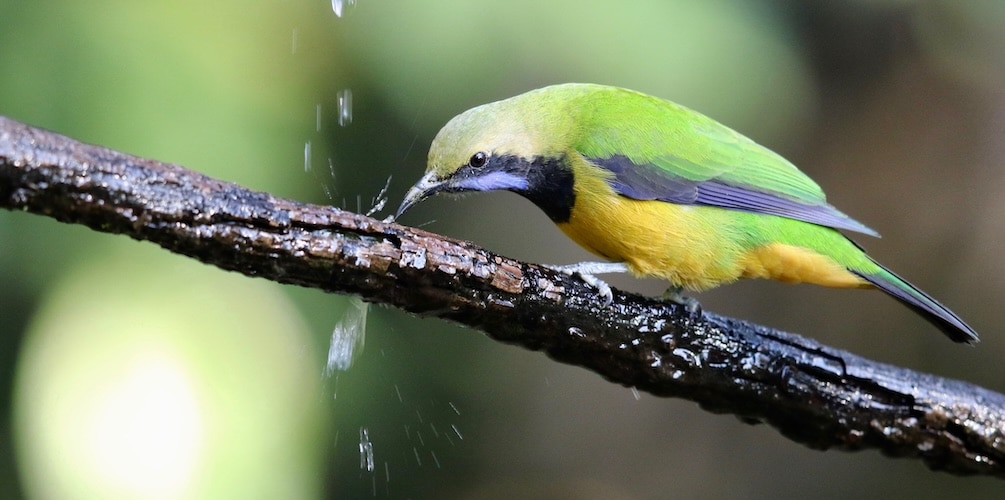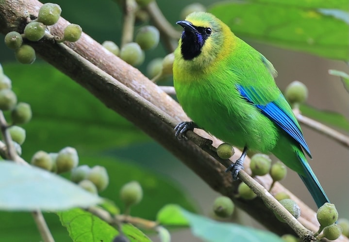 Leafbirds are always found in trees and shrubs. Most are restricted to evergreen forests except the Golden-fronted Leafbird and Jerdon’s Leafbird which live in deciduous monsoon forests, and the Orange-bellied Leafbird, which occurs in deciduous forests. Within this requirement, they occupy all broadleaf forest types in the South and Southeast Asia. The highest altitude they occur at is 2500m. Some species, such as the Blue-masked Leafbird, have montane distributions, rarely descending below 1000m.