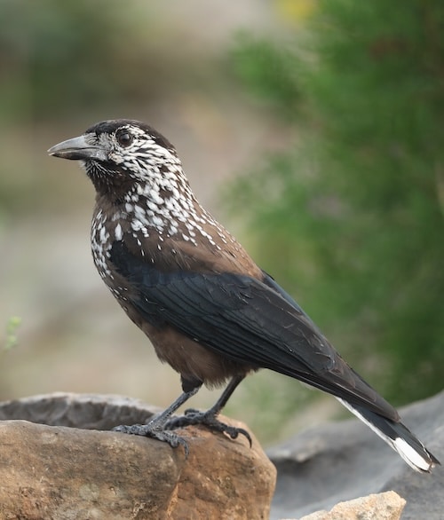 Species AccountLarge, distinctive corvid, roughly the size of a Eurasian Jay. Note the long and heavy bill, white-flecked face, and black cap. -