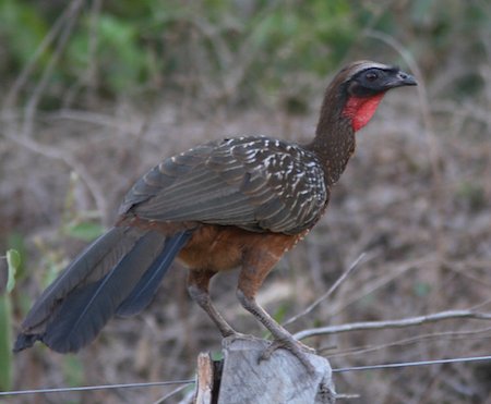 Species AccountLarge guan with a long tail and red throat wattle. Dark brown overall with an olive tinge to the upperparts and warmer brown belly. -