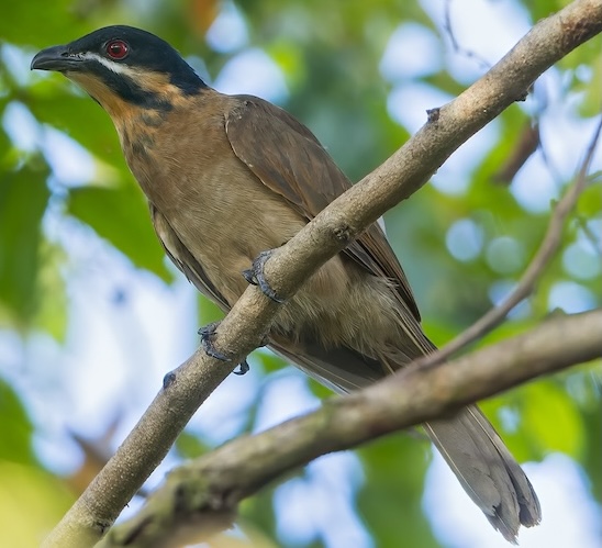 A medium-sized cuckoo of lowland and hill forest. Both sexes have a brown body, thick bill, and white stripe below the red eye.