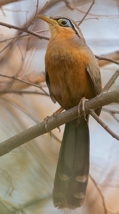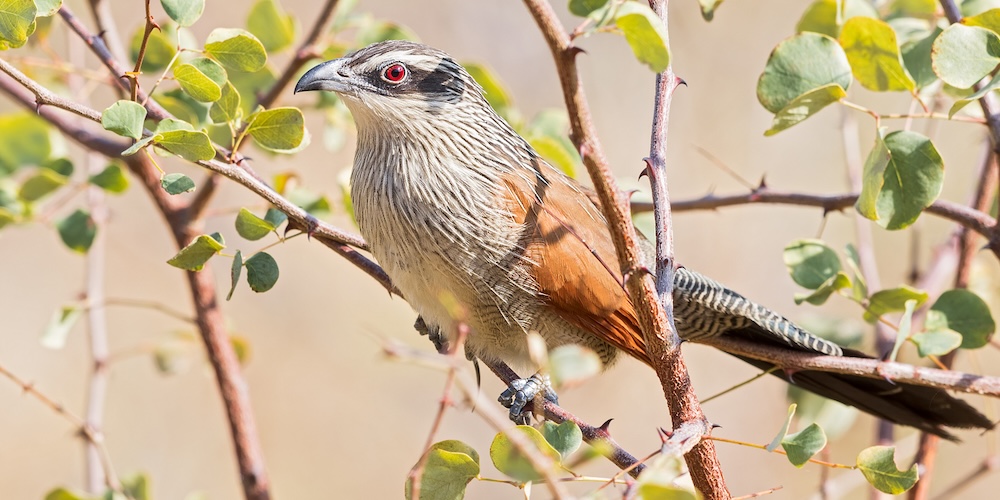 Gray-brown cuckoo with a uniquely hooked red bill. Teardrop-shaped dark patch around each eye gives it a distinctly fashionable, elegant appearance.