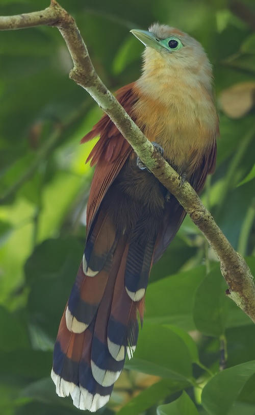 Very striking and long-tailed bright rusty cuckoo, widespread in tropical lowlands and locally up into foothills.