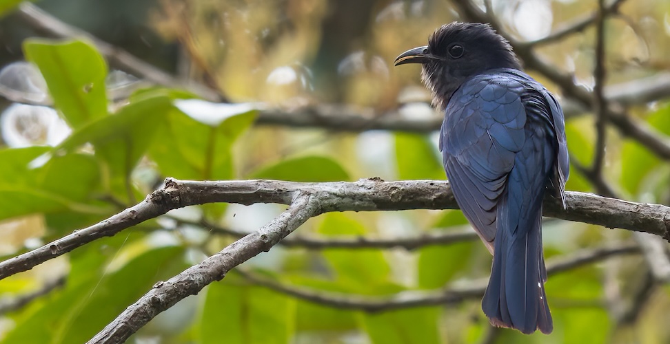 A small, slim black cuckoo rather similar to Black Drongo but smaller, with a curved bill. Adult black with white bars in the undertail, shorter-tailed...