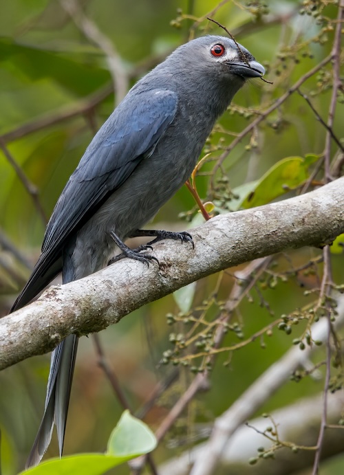A slim, medium-sized drongo with bright red eyes and gray plumage that is almost black.