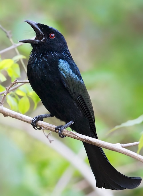 drongos are sleek and shiny black flycatching birds of Africa, Asia, and Australia, the species usually distinguished by rackets or distinctive bends or warps