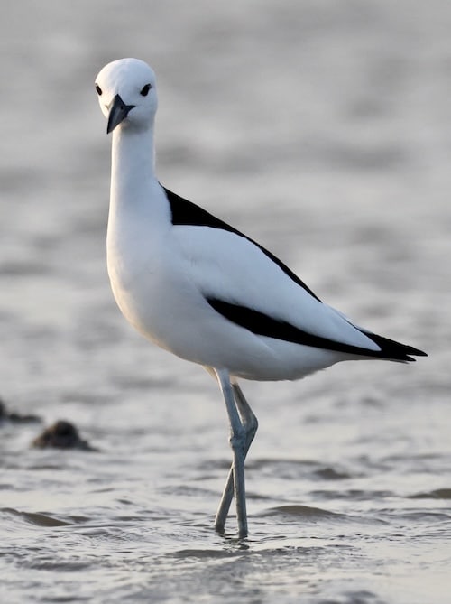The Crab Plover resembles a plover, but has very long grey legs and a strong heavy black bill similar to a tern. Its black-and-white plumage and long-necked upright posture with heavy bill makes it distinctive and unmistakable. Its bill is unique among waders, and specialised for eating crabs. They also have partially webbed toes. The plumage is white except for black on its back and in the primary feathers of the wings. They are noisy birds, calling frequently on their breeding sites and in their wintering grounds. The usual call is a ‘ka’ similar to that of the Bar-tailed Godwit, but repeated rapidly. Flocks may produce a whinnying sound that rises and at in the breeding season produce whistling ‘kew-ki-ki’ notes.