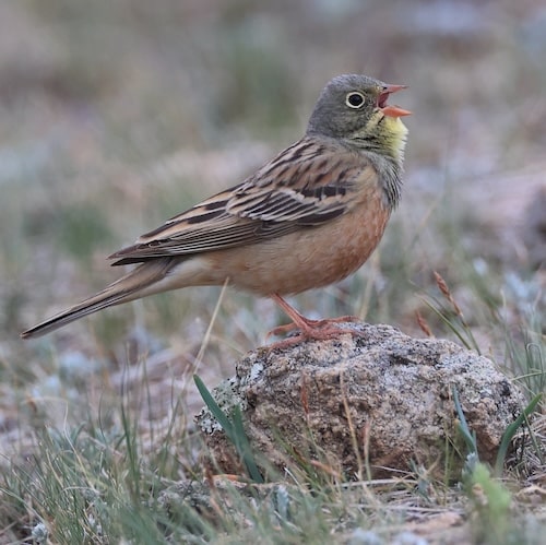 Species AccountVery similar to Ortolan Bunting, but note that the base color of the head is gray and not green, and the throat is orange and not yellow. -