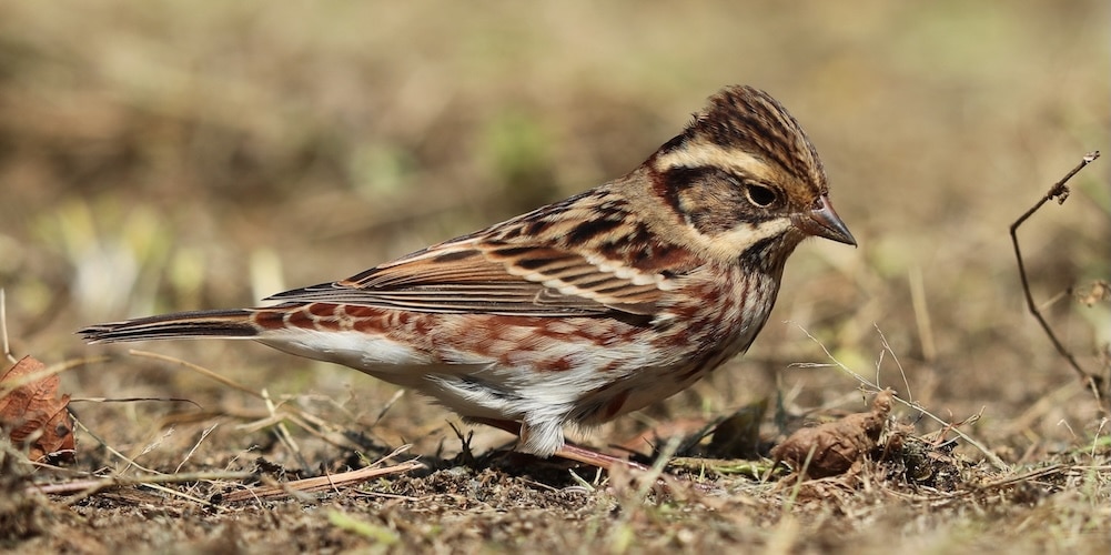 Species AccountSmall bunting with an attractive contrasting head pattern: black crown with red-brown central stripe and pale eyering. -