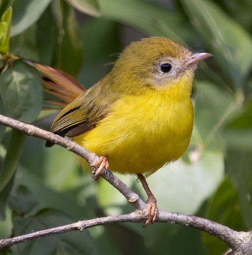 Livingstone’s Flycatcher Erythrocercus livingstonei, is found in Malawi, Mozambique, Tanzania, Zambia, and Zimbabwe. Its natural habitats are subtropical or tropical dry forests and subtropical or tropical moist shrubland, it favours coastal thickets and riverine forest. It has olive underparts, yellow upperparts and a black-banded rufous tail which it spreads or flicks constantly. It has a rapid series of ‘chiut’ calls and a short but melodious and warbling song.