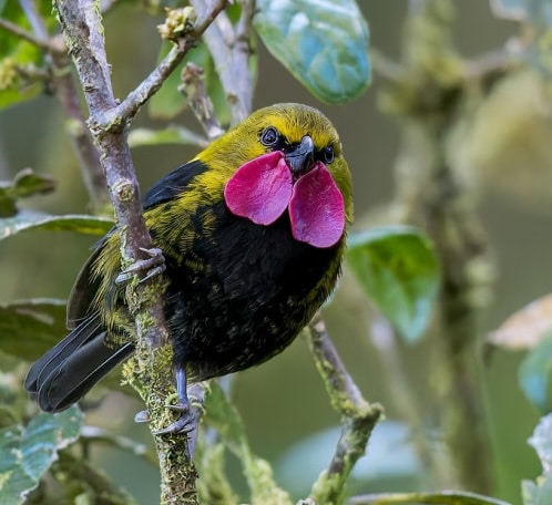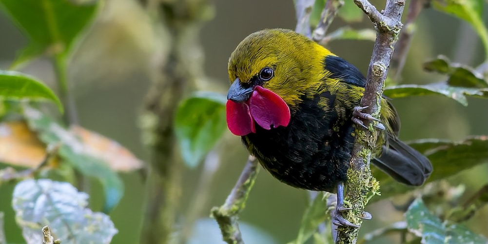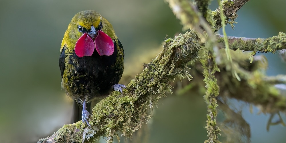 A fairly small, plump bird with a unique bill shape of montane forest. Male is yellow-green with black wing, chest, and two large, pink, fleshy wattles beside...