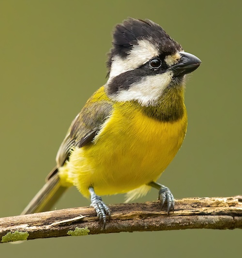 Species AccountSmall bird with short, heavy bill. Green above, with a mainly yellow front except for a broad white belly strip. Has a bold black-and-white head pattern. -