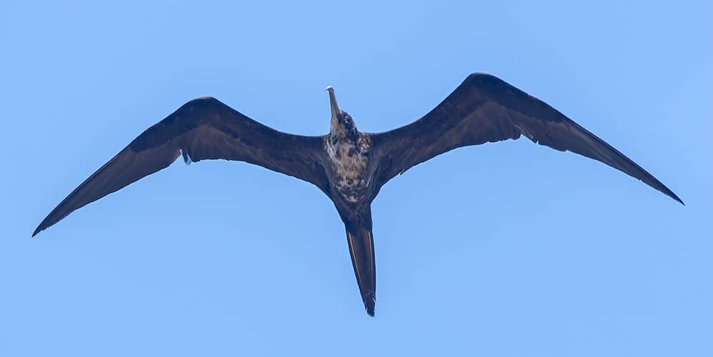 The Fregatidae or Frigatebirds are a family of seabirds, which are found across all tropical and subtropical oceans. They are Suliformes, along with Sulidae (Boobies & Gannets), Anhingidae (Darters) and Phalacrocoracidae (Cormorants & Shags). The five extant species are classified in a single genus, Fregata. All have predominantly black plumage, long, deeply forked tails and long hooked bills. Females have white underbellies and males have a distinctive red gular pouch, which they inflate during the breeding season to attract females. Their wings are long and pointed and can span up to 2.3 metres (7.5 ft), the largest wing area to body weight ratio of any bird.