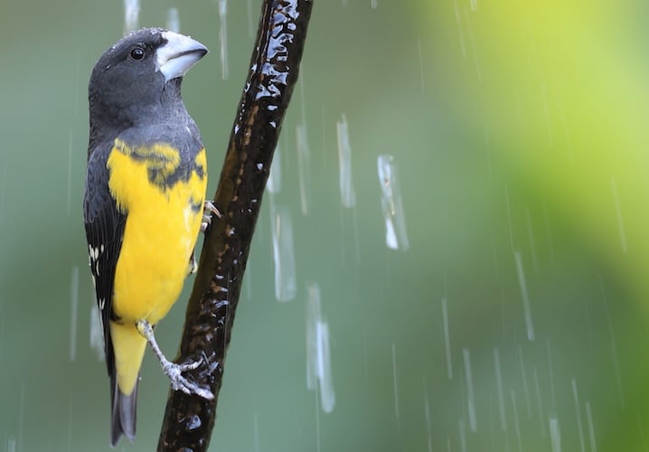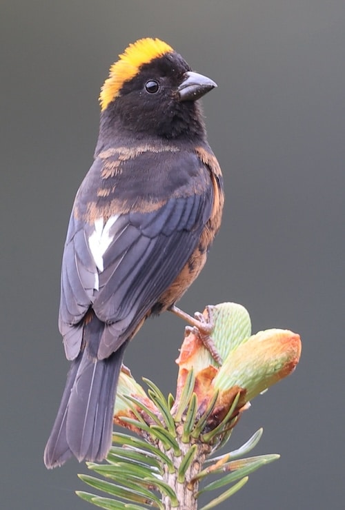 Species AccountA brightly-colored finch usually found in hilly or montane coniferous and mixed forests. Male is black above and yellow below. -