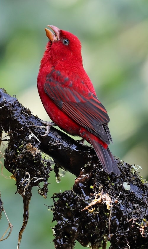 Species AccountA blood-red Hawaiian honeycreeper found on all of the larger islands. Smaller and darker red than the Iiwi, with a shorter black bill and white under the tail. -