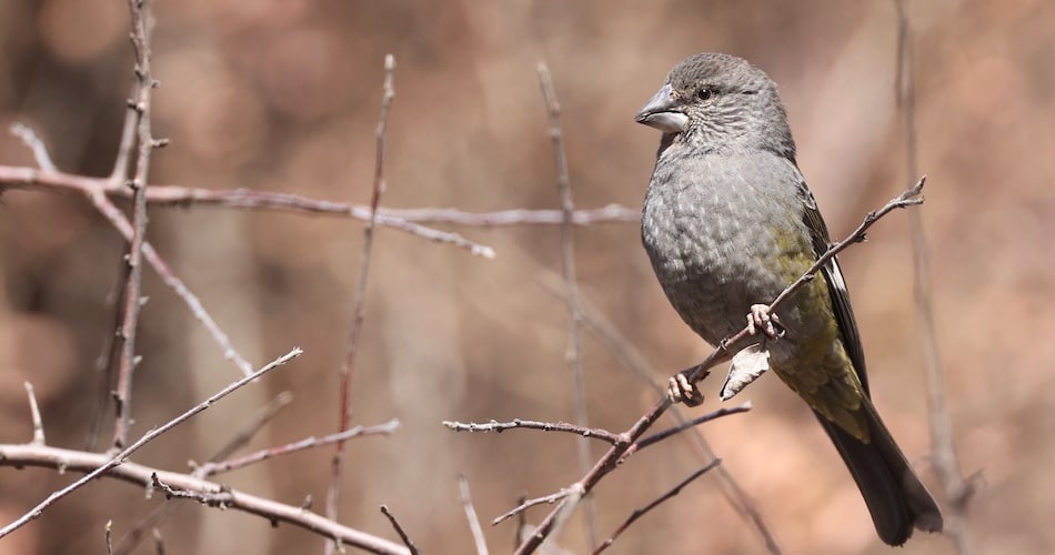 Species AccountSmall finch with a big, chunky bill, long wings, and a short tail. -