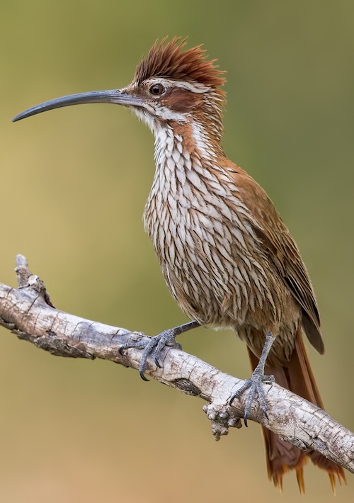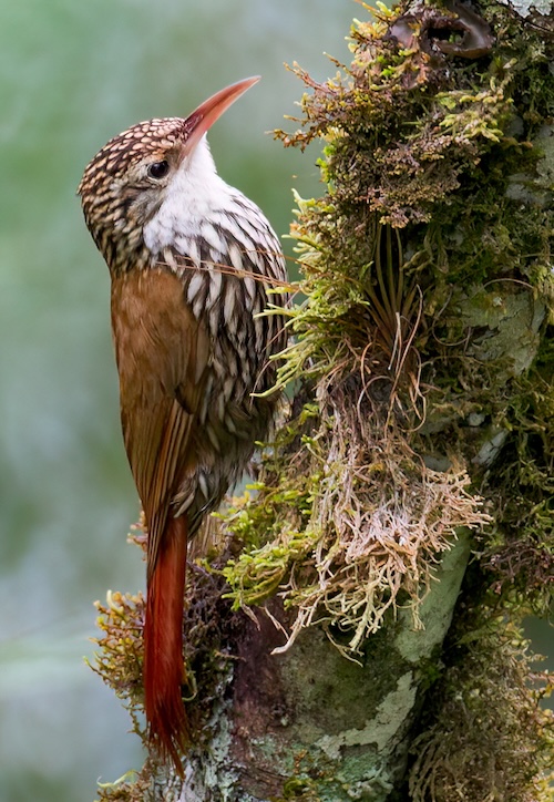 Bulky woodcreeper with a stout, deeply curved bill. Very rare in tall, wet Andean cloud forest. Brown with buffy streaks on head, neck, and underparts.