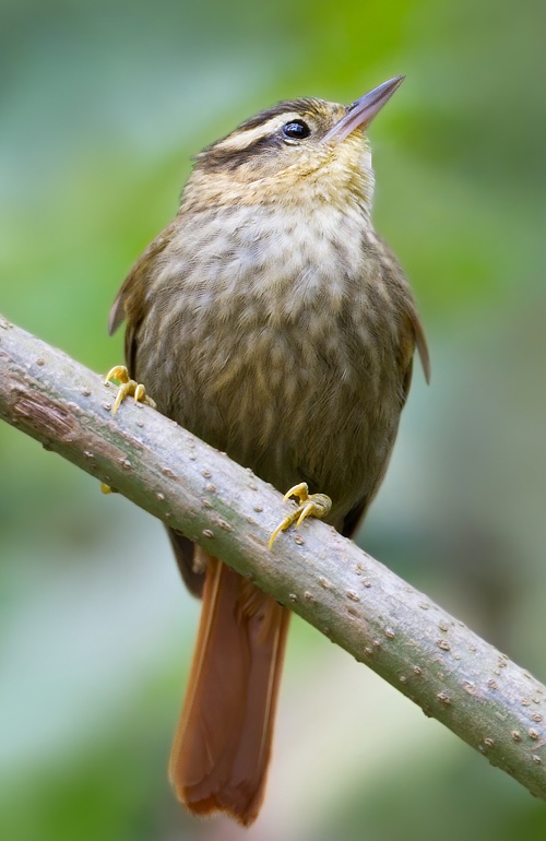 Reddish-brown bird with a distinctive upturned bill. Found almost exclusively in bamboo thickets, but occasionally also in dense viny areas.