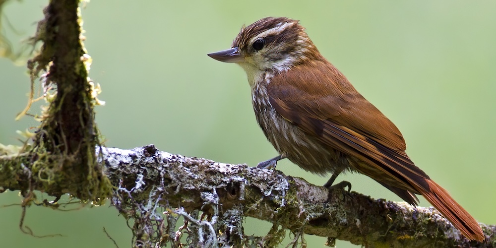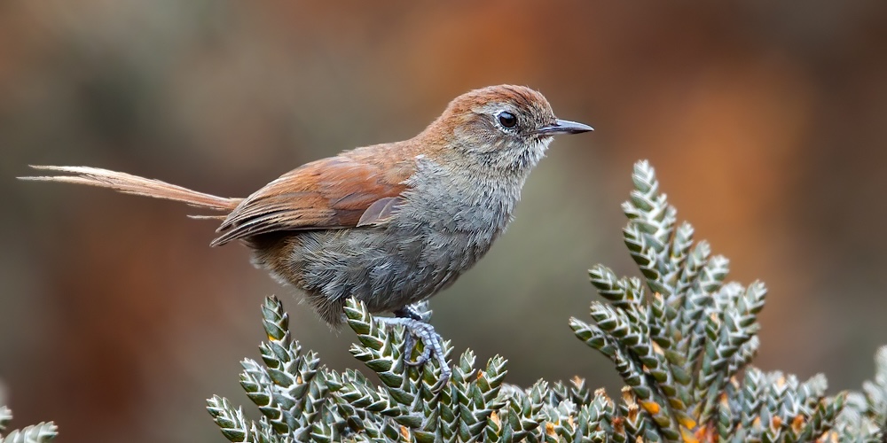 Small foliage-gleaner with a short pointed bill and long tail. Found in the canopy of montane forests including Araucaria forests...