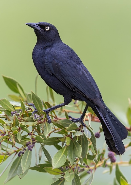 Species AccountSlim, medium-sized blackbird closely associated with water. Plumage is entirely black with iridescent sheen; note dark eyes. -
