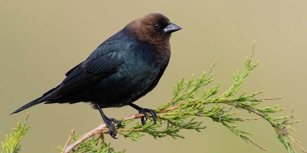 Species AccountShort tail and stocky body. Males are glossy black with chocolate brown head. Females are gray-brown overall, without bold streaks, but slightly paler throat. -