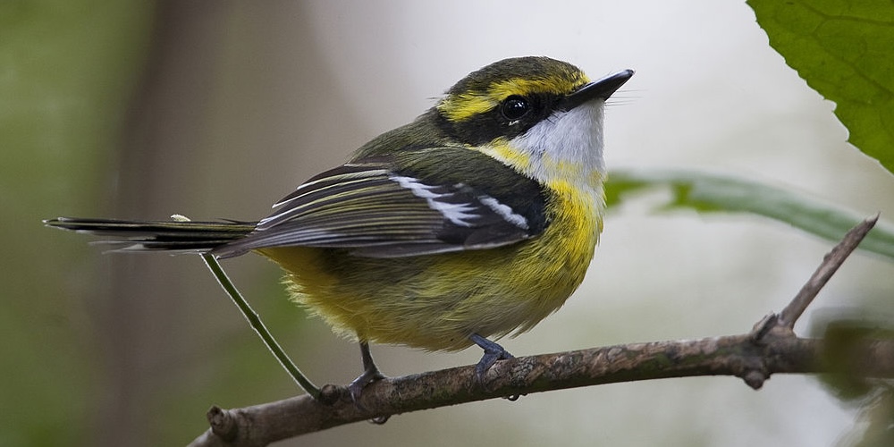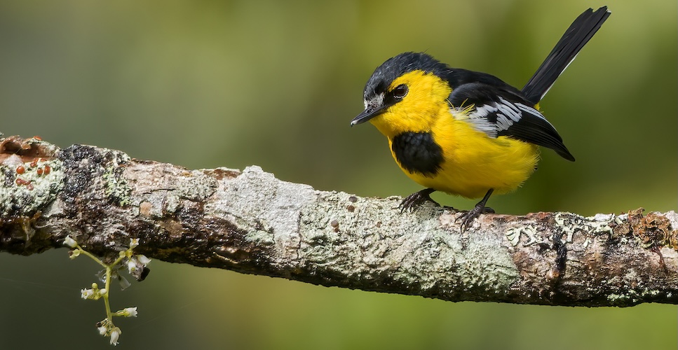 The Yellow–breasted Boatbill is a small bird with an extremely wide and flat beak. Its underparts are bright yellow, and its upperparts olive in females and black in males, with clear white wing-bars, a white throat, and yellowish ‘eyebrow’. It has a long, rounded tail that is often cocked up. The juveniles lack the white throat patch and have a stubbier tail. It is found in rainforest habitats across the New Guinea mainland and islands and in Queensland, Australia’s wet forest, where it tends to forage in the canopy.