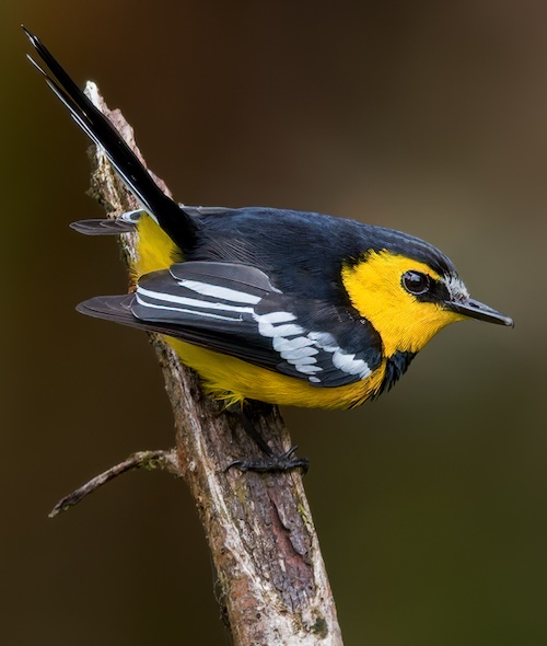 The Yellow–breasted Boatbill is a small bird with an extremely wide and flat beak. Its underparts are bright yellow, and its upperparts olive in females and black in males, with clear white wing-bars, a white throat, and yellowish ‘eyebrow’. It has a long, rounded tail that is often cocked up. The juveniles lack the white throat patch and have a stubbier tail. It is found in rainforest habitats across the New Guinea mainland and islands and in Queensland, Australia’s wet forest, where it tends to forage in the canopy.