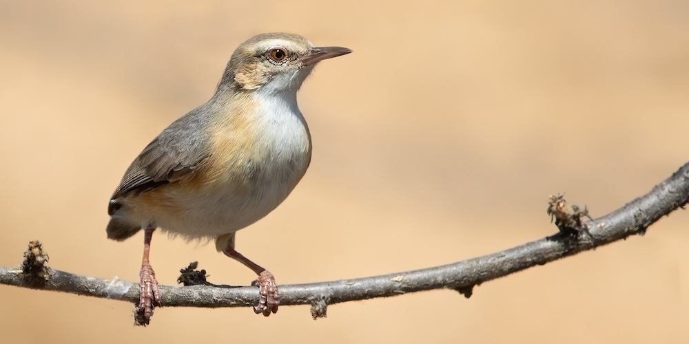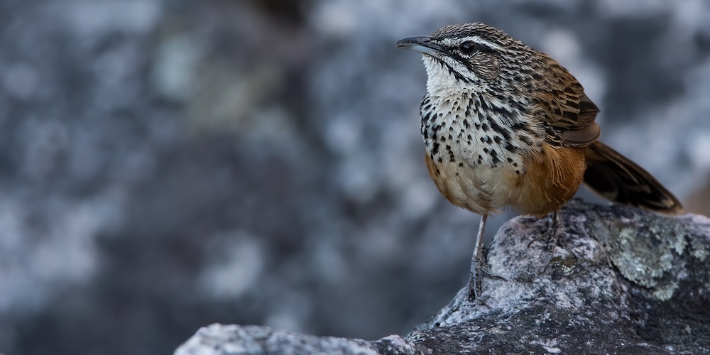A very unusual large and chunky warbler with a white eyebrow and throat, streaked breast, and rufous belly. Found on and around rocks within arid savanna.