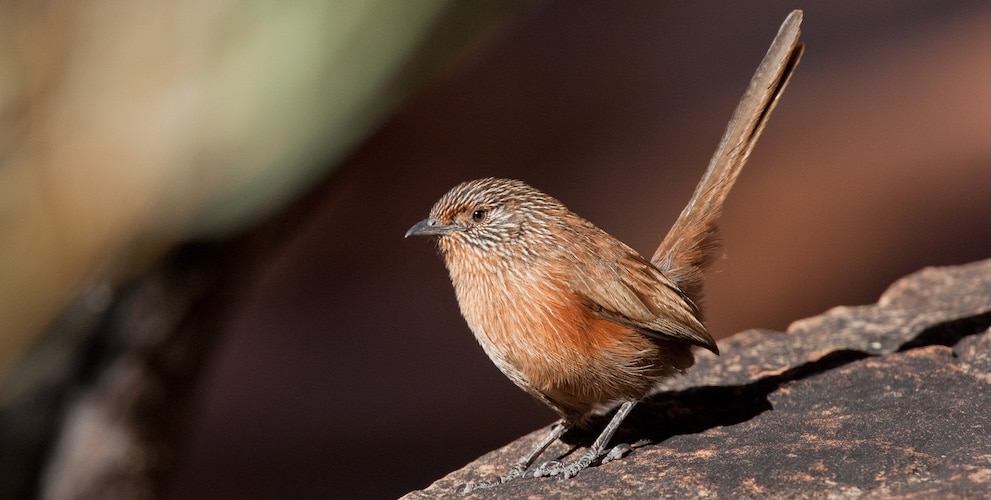 Species AccountSmall rusty-brown bird with finely streaked plumage and long cocked tail, found in rocky areas and gorges around spinifex clumps of central Australia. -