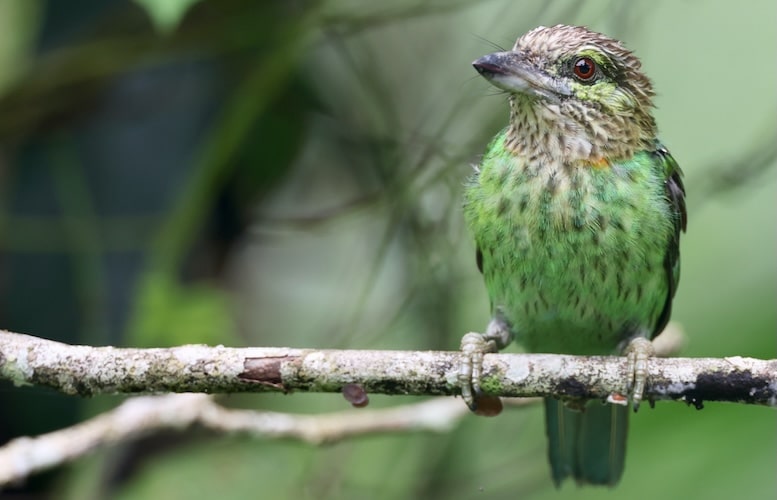 Species AccountTypical barbet, green with a brightly-colored face. Facial pattern is plainer than some barbets’, but subtly attractive nonetheless: blue overall with red speckles on the edges and black lines through the eye and across the cheek. -