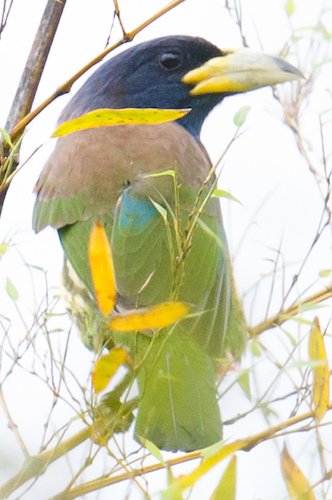 Species AccountLarge barbet with an immense chisel-like bill. Leaf-green overall, with a red throat, black mask, and bright yellow crown and round spot at the base of the bill... -
