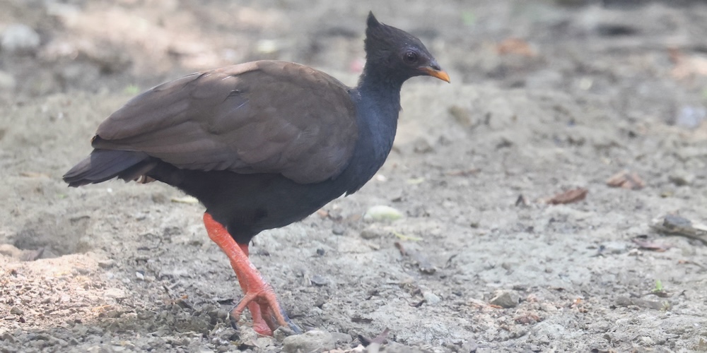 Species AccountA large, black ground bird of rainforests from the lowlands to mid-mountains. Red-orange legs stand out against the all black plumage. -