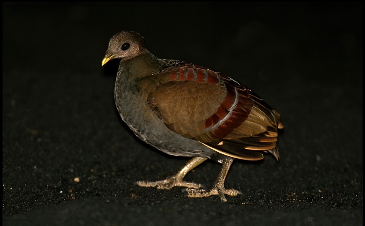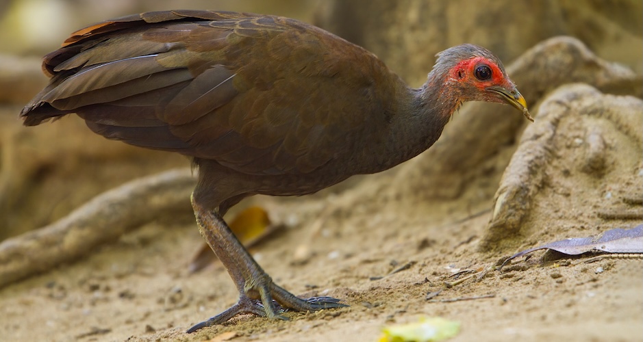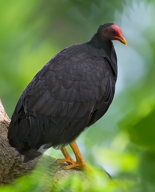 Species AccountA large, black ground bird of lowland rainforest. Bare gray facial skin, black bill and bright yellow legs. It is very shy and forages on the forest floor. -