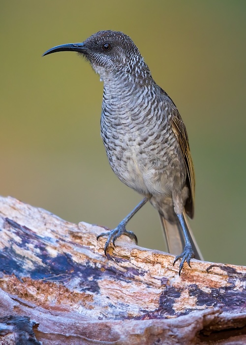 Species AccountWell-marked medium-sized honeyeater with a long, thin bill. Densely scalloped white and brownish plumage with dull olive-brown wings distinguishes this species. -