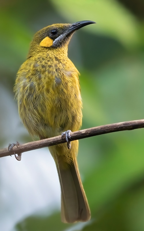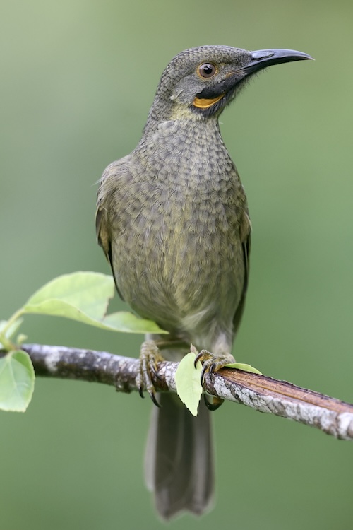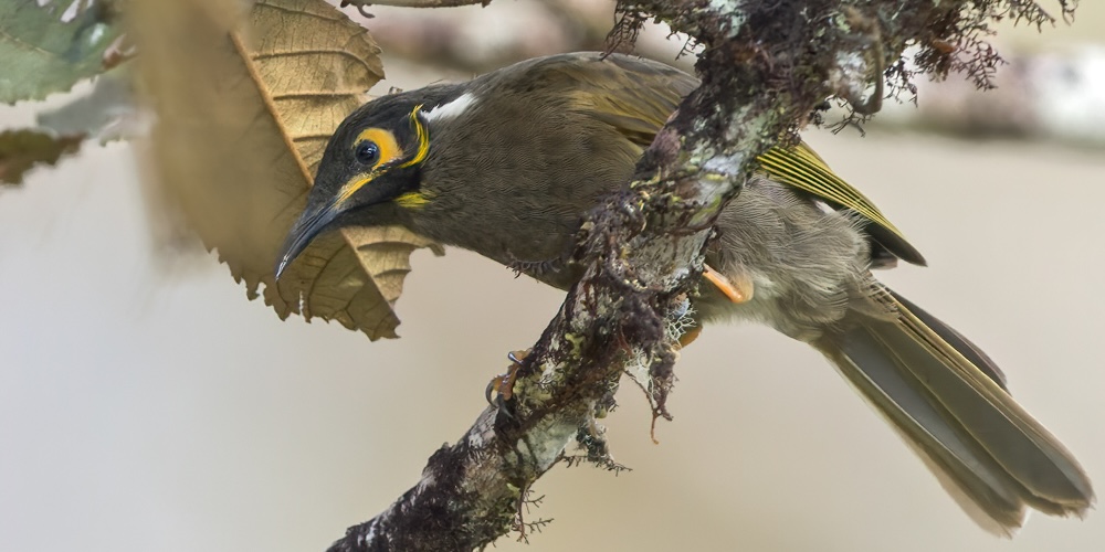 Species AccountA medium-sized grayish honeyeater with an olive cast to the wings and a bright yellow-orange wattle on the cheek below the eye. Found mainly in mature forest. -
