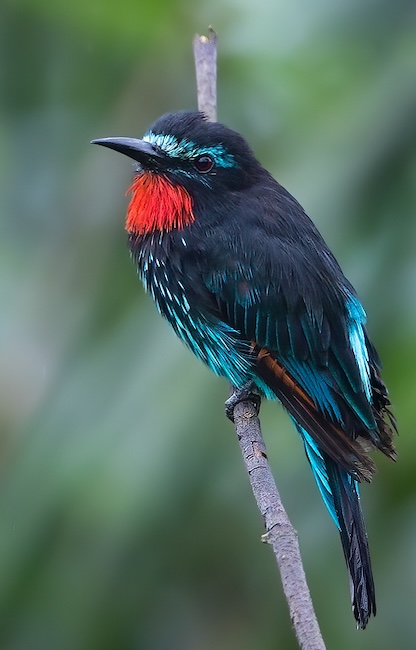 Species AccountA bee-eater of forest and forest edge that appears entirely black at a distance, but in good light shows a bright red throat and electric blue belly. -
