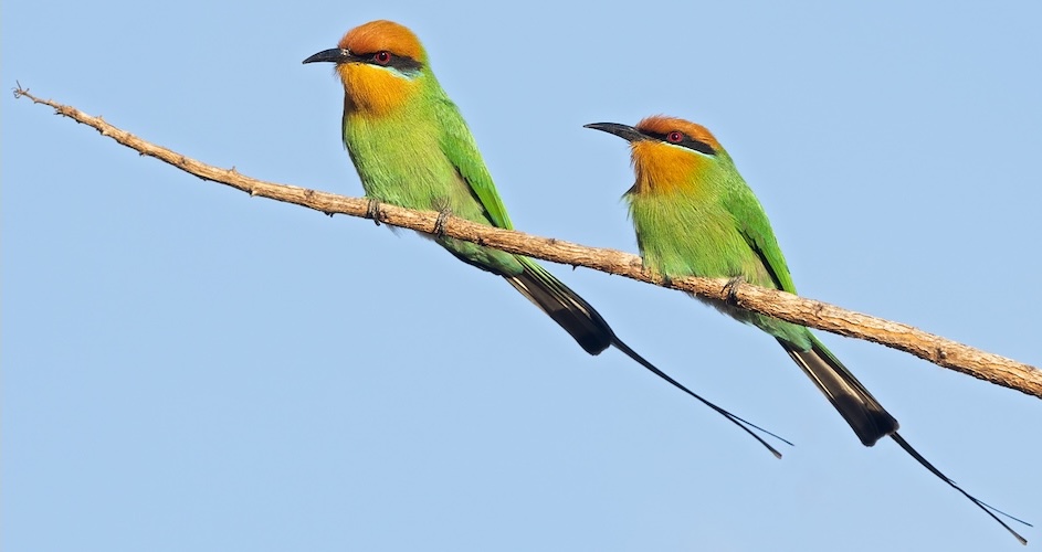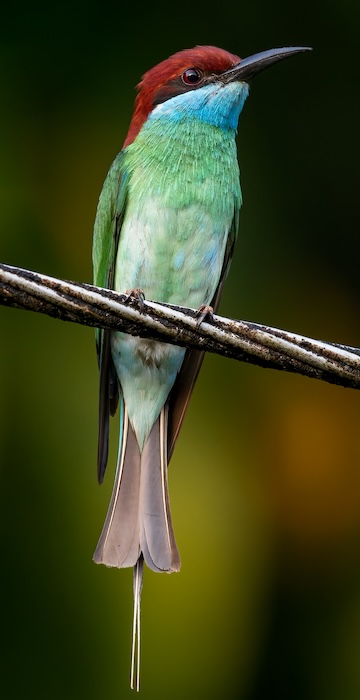 Species AccountBeautiful mid-sized bee-eater with a deeply-forked blue tail. Immature has duller coloration but still has distinctive tail shape. -