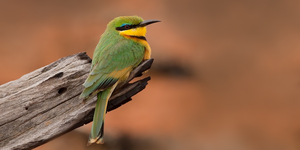 Species AccountA lime-green bee-eater with a thin black mask edged with aquamarine blue. Bright yellow-and-red throat patch is small compared to many other bee-eaters. -
